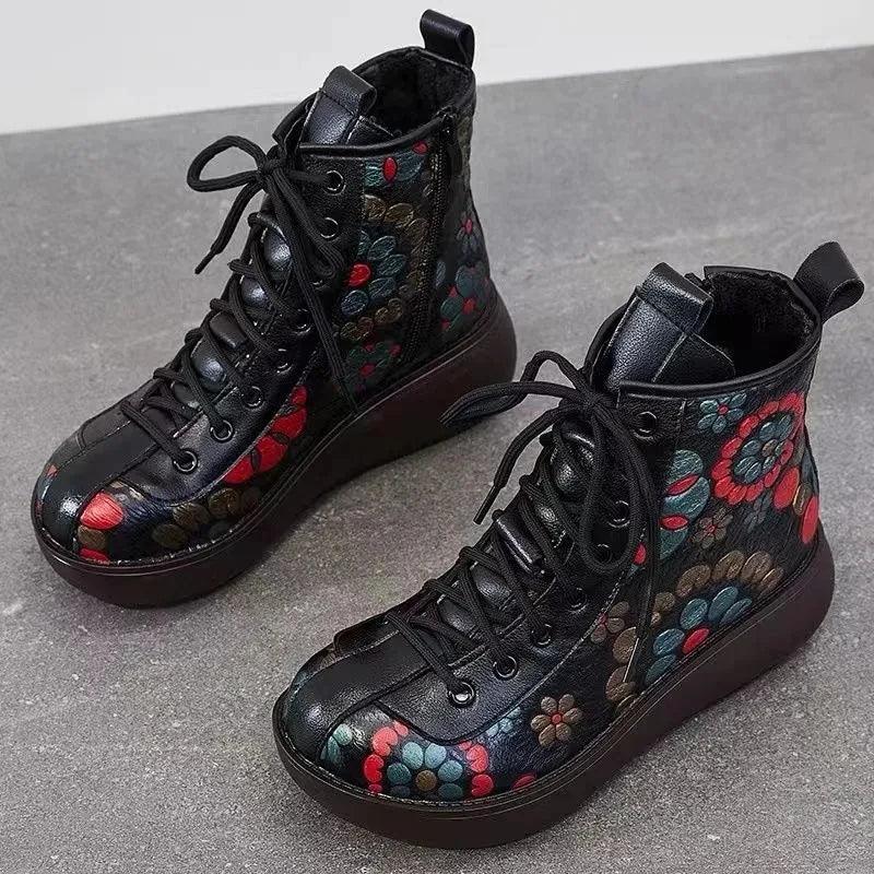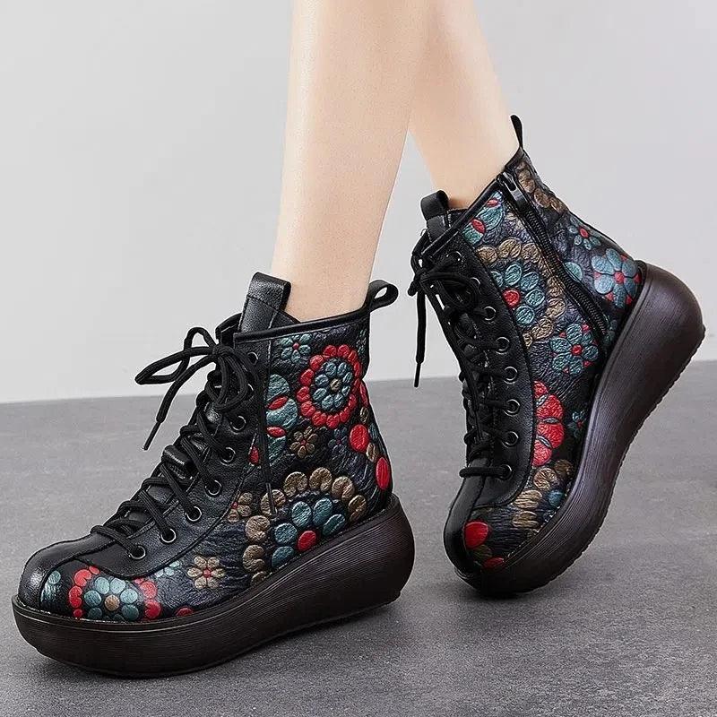 Ces bottines en cuir imprimé arborent un style ethnique captivant, parfait pour ajouter une touche unique à votre tenue. Leur tube de taille moyenne et leur semelle plate garantissent un confort optimal tout au long de la journée. Idéales pour l’automne et l’hiver, ces bottes sont le choix idéal pour les dernières tendances de saison.
