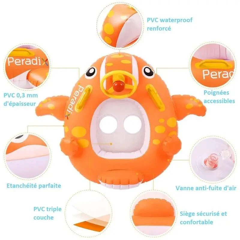 Cette bouée gonflable baleine pour bébé avec parasol est un must-have à posséder durant l’été. Doté d’un volant, d’un siège sécurisé et confortable, cette bouée bébé de couleur orange, rose ou bleu et en forme de baleine vous fera vivre des moments d’émotion et de partage avec votre bambin !