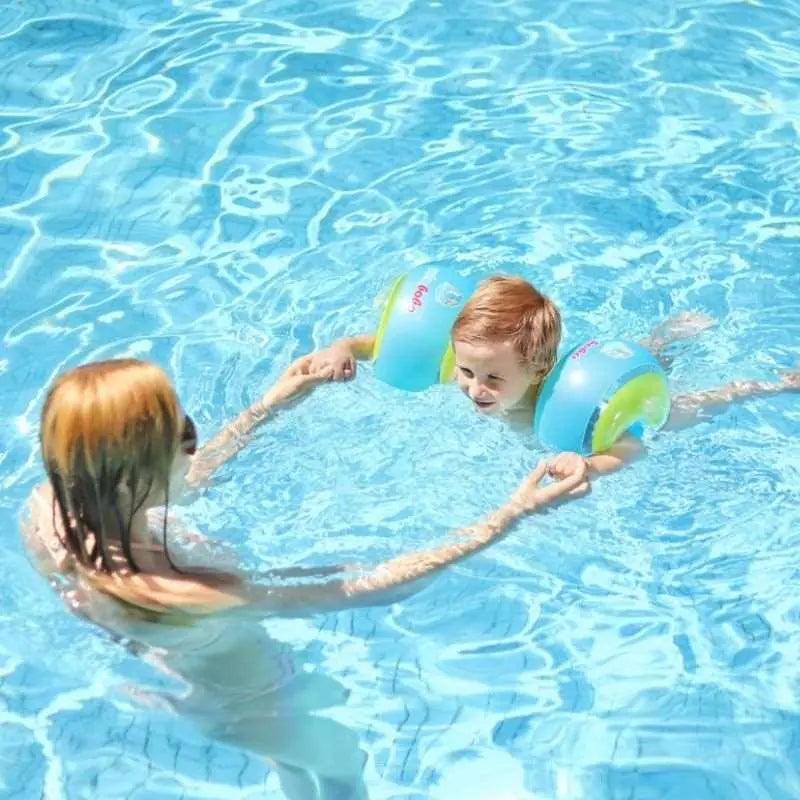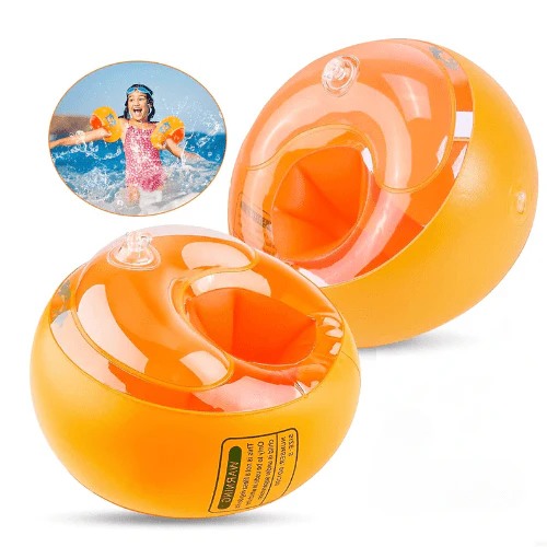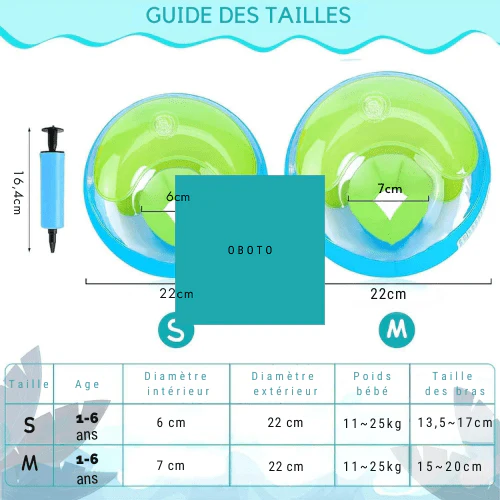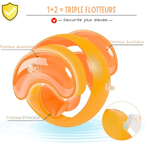 - Des brassards ronds avec 3 flotteurs totalement indépendants, permettant à votre bébé d’apprendre à nager en toute sécurité,