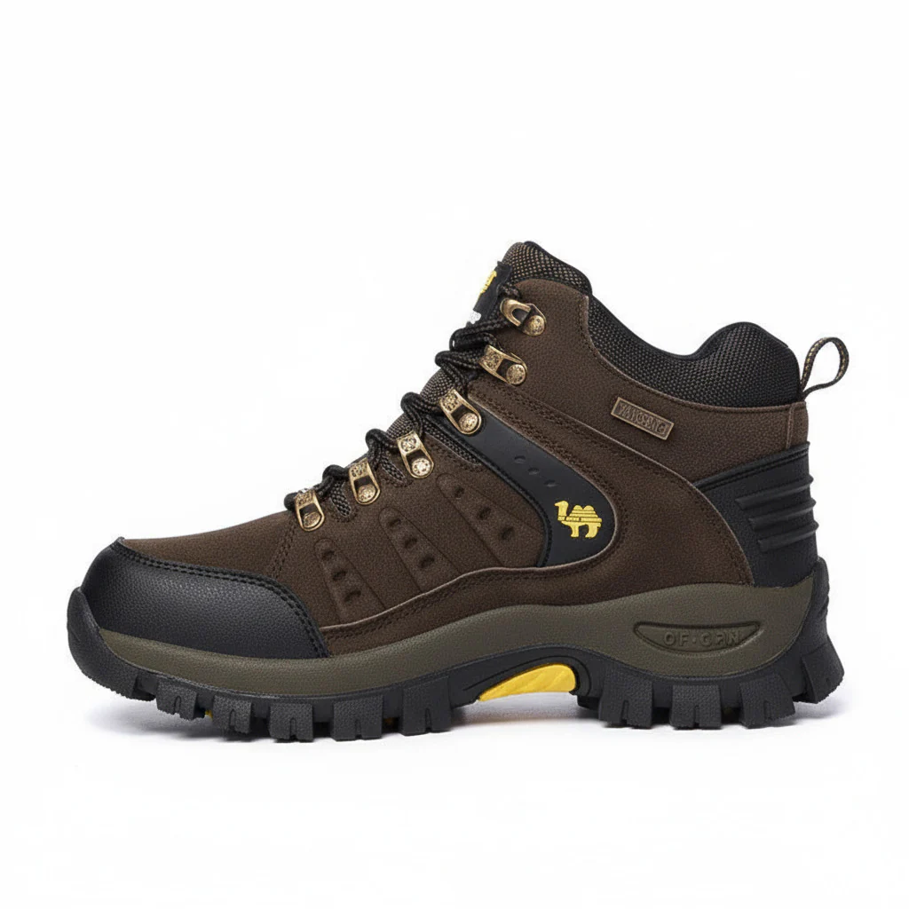 La tige haute en PU synthétique robuste, dotée d’un traitement déperlant, protège la cheville et empêche l’humidité légère de pénétrer. Un pare-pierre avant renforce la protection contre les chocs et les impacts de pierres. L’intérieur en mesh respirant favorise la circulation de l’air et maintient les pieds au sec, même après plusieurs heures de marche soutenue. Les crochets et œillets métalliques anticorrosion assurent un laçage ferme et durable, y compris dans des conditions humides.