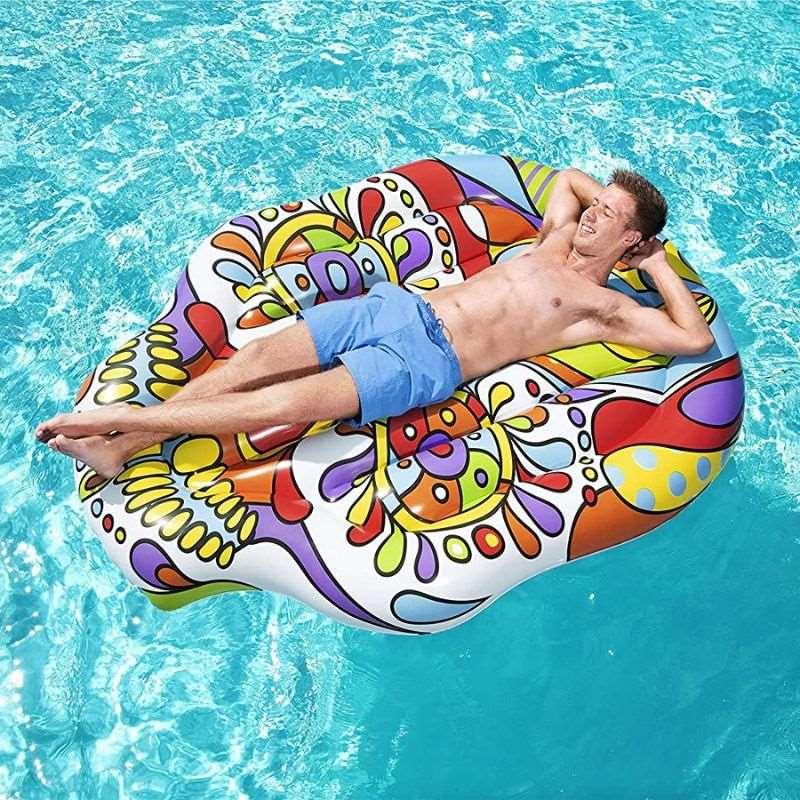 Osez vous équiper du matelas gonflable tête de mort durant la période estivale. D’une taille généreuse et multicolore, la bouée tête de mort mexicaine ne passera pas inaperçue cet été. Flashy avec ses couleurs acidulées et sa forme de crâne, cette bouée gonflable géante fait dorénavant parti des Best-Sellers de la catégorie.
