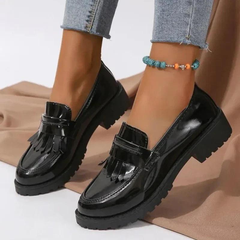 Optez pour l’élégance et la sophistication avec nos Mocassins Orthopédique femmes vernis à bouts arrondis, ornés de franges. Le fini brillant de ces mocassins ajoute une touche de glamour à votre look, tandis que les franges apportent une note d’originalité et de dynamisme. Ces chaussures sont conçues pour celles qui souhaitent se démarquer avec assurance et confiance.