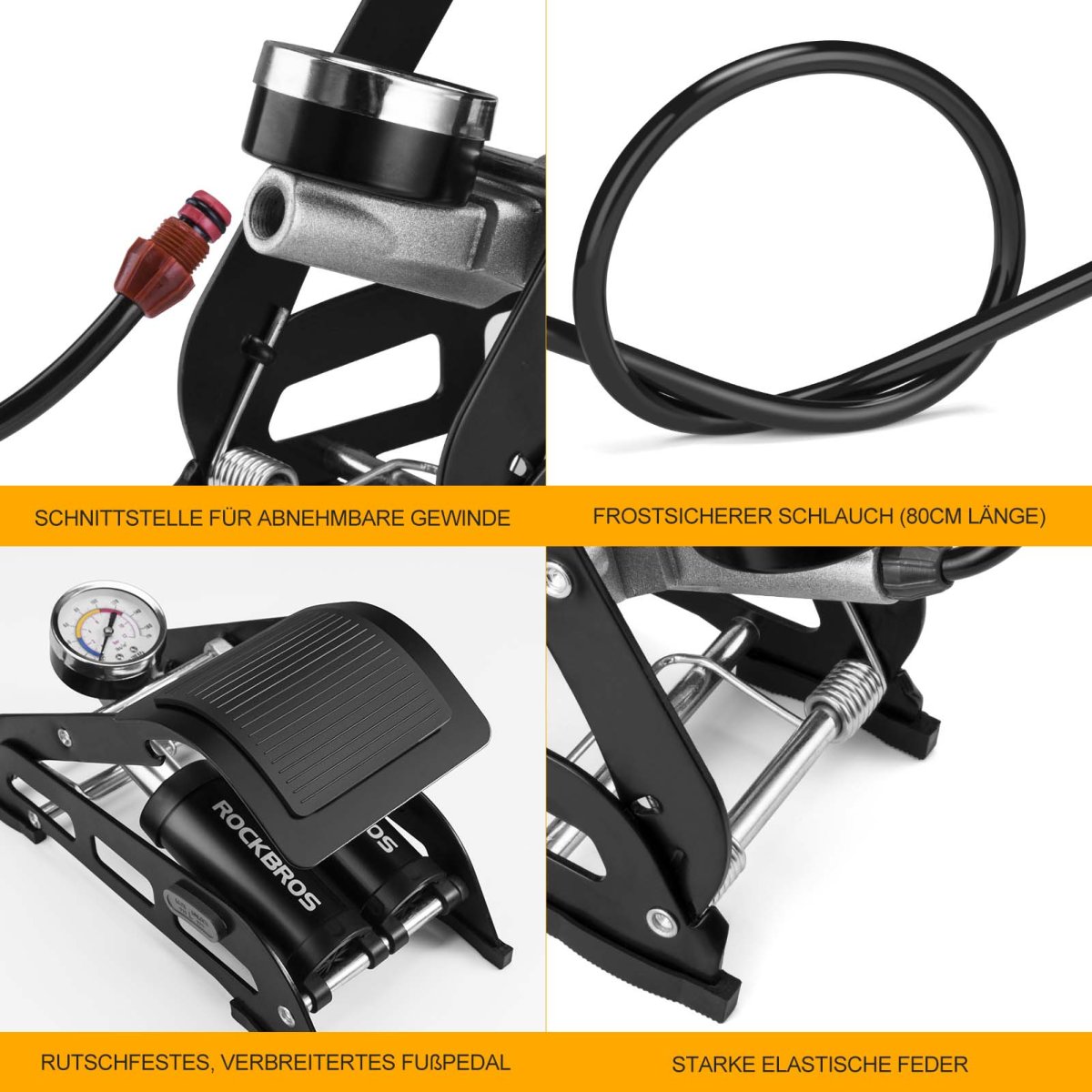 - Pompe à pied à double cylindre : La pompe à air à double cylindre ROCKBROS est dotée de deux cylindres renforcés pour une pression d’air plus élevée, moins de fuites et un gonflage plus rapide.