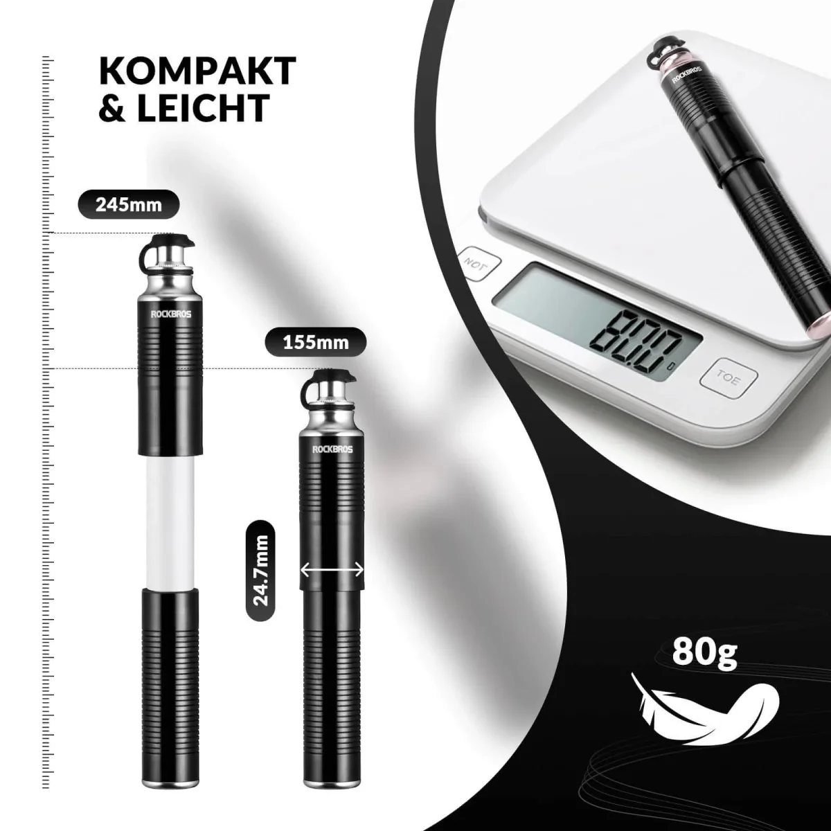 La pompe à main en aluminium ROCKBROS est compacte et facile à transporter. Elle se fixe au cadre pour un gain de place optimal. Avec une pression maximale de 110 PSI et sa compatibilité avec les valves Schrader et Presta, elle est idéale pour un usage quotidien. Le tuyau dissimulé permet un gain de place supplémentaire. Fabriquée en alliage d’aluminium de haute qualité, la pompe est durable et résistante à la rouille.