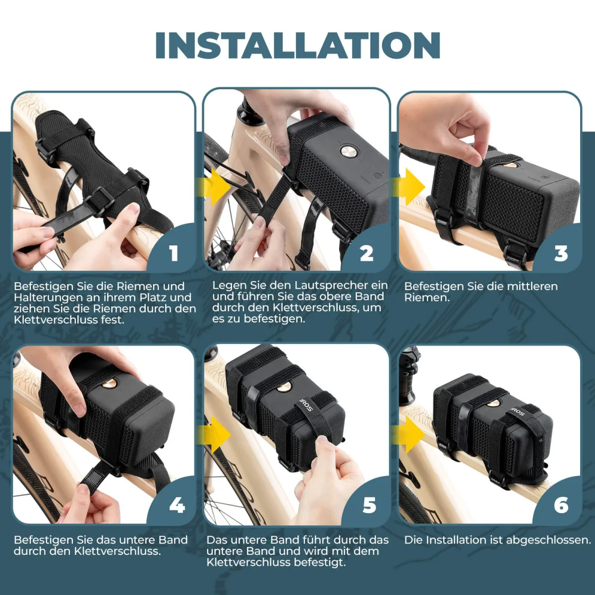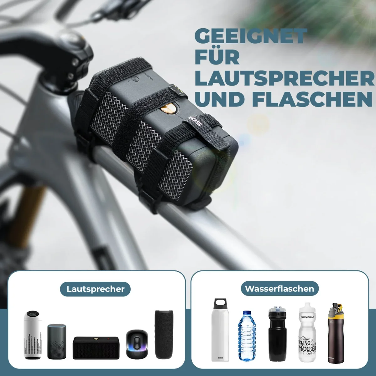 Les doubles sangles élastiques Magic Tape assurent un maintien sûr des haut-parleurs et des bouteilles d’eau – idéal pour les balades à vélo.