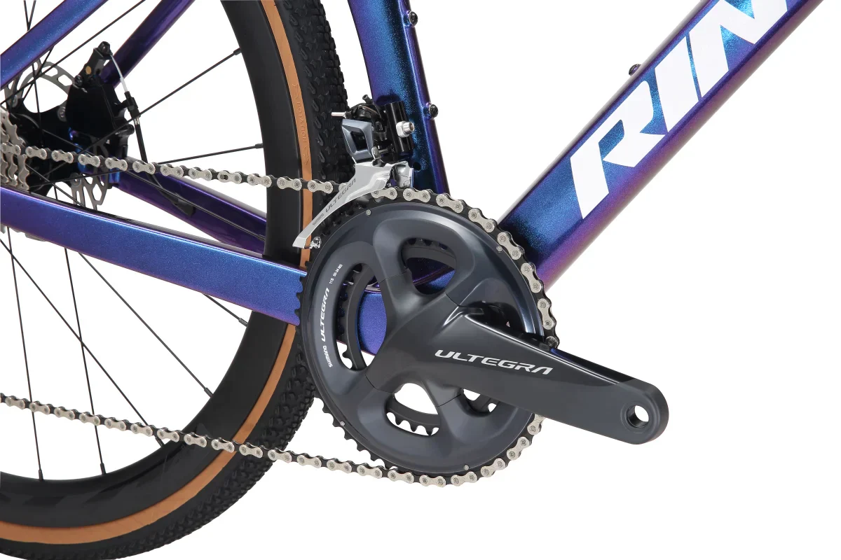 Le RINOS Gravel Bike est équipé de 22 vitesses contrôlées par un dérailleur SHIMANO Ultegra ST-R8000. Le dérailleur SHIMANO Ultegra R8000 à l’arrière du vélo fonctionne en harmonie avec la cassette 11-30T pour permettre des changements de vitesse rapides et une large gamme de vitesses.