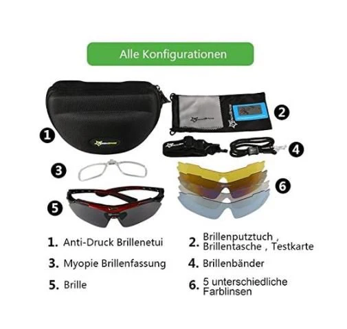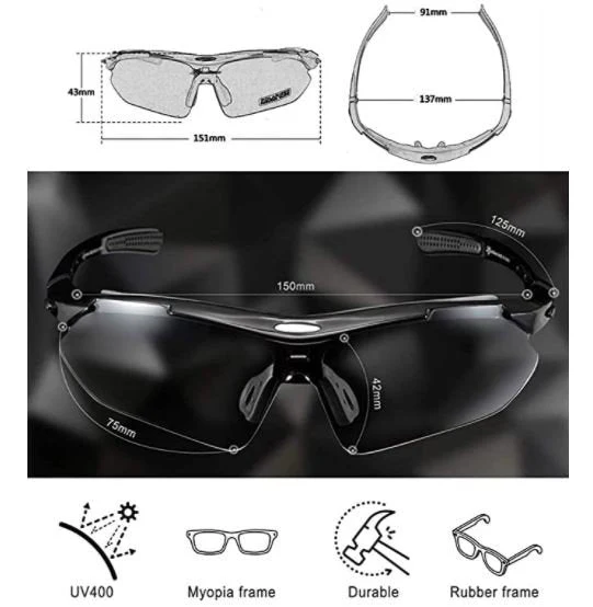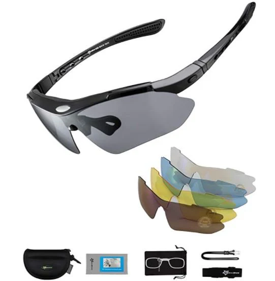 5 verres interchangeables : 1 paire de verres gris + 4 paires de verres interchangeables d’origine offrent plus de choix pour différentes activités de plein air. Les verres polarisés gris protègent vos yeux des rayons du soleil. La lentille jaune convient aux activités nocturnes. La lentille transparente est anti-buée et est conçue pour les jours nuageux et pluvieux. La lentille marron foncé convient à la conduite et la lentille bleue convient aux voyages de vacances.