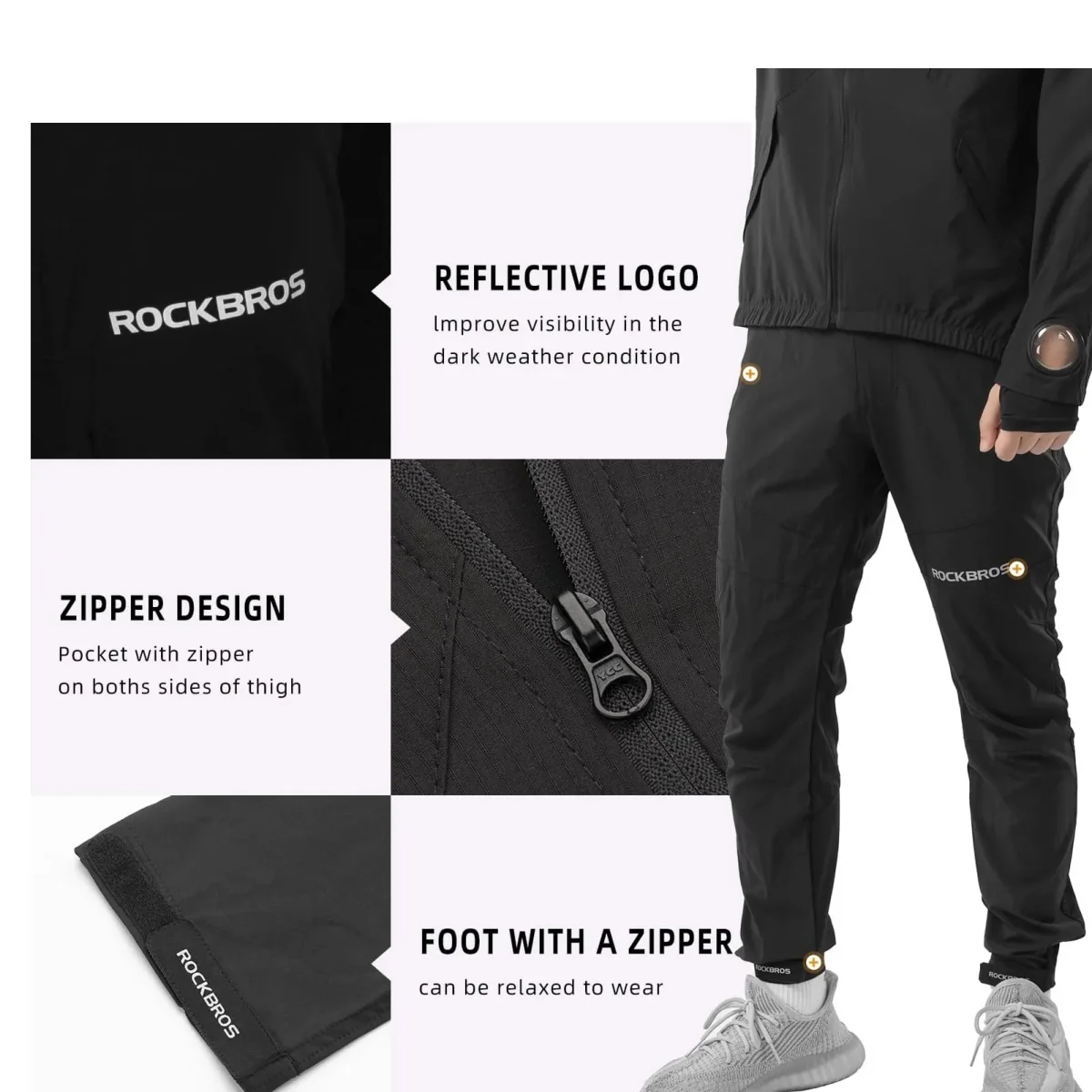 CONCEPTION DE SÉCURITÉ : Le bas d’une jambe de pantalon est conçu avec du velcro, vous pouvez ajuster l’étanchéité en fonction de vos besoins. Bandes réfléchissantes à l’avant et à l’arrière du pantalon pour améliorer la sécurité la nuit.