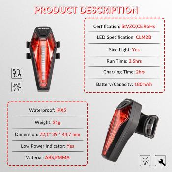 Feu LED avec StVZO : le feu arrière de vélo ROCKBROS certifié par StVZO, CE et ROHS, assure une sécurité optimale. L’angle du faisceau est de 220°. Il vous offre la meilleure protection sur la voie publique.