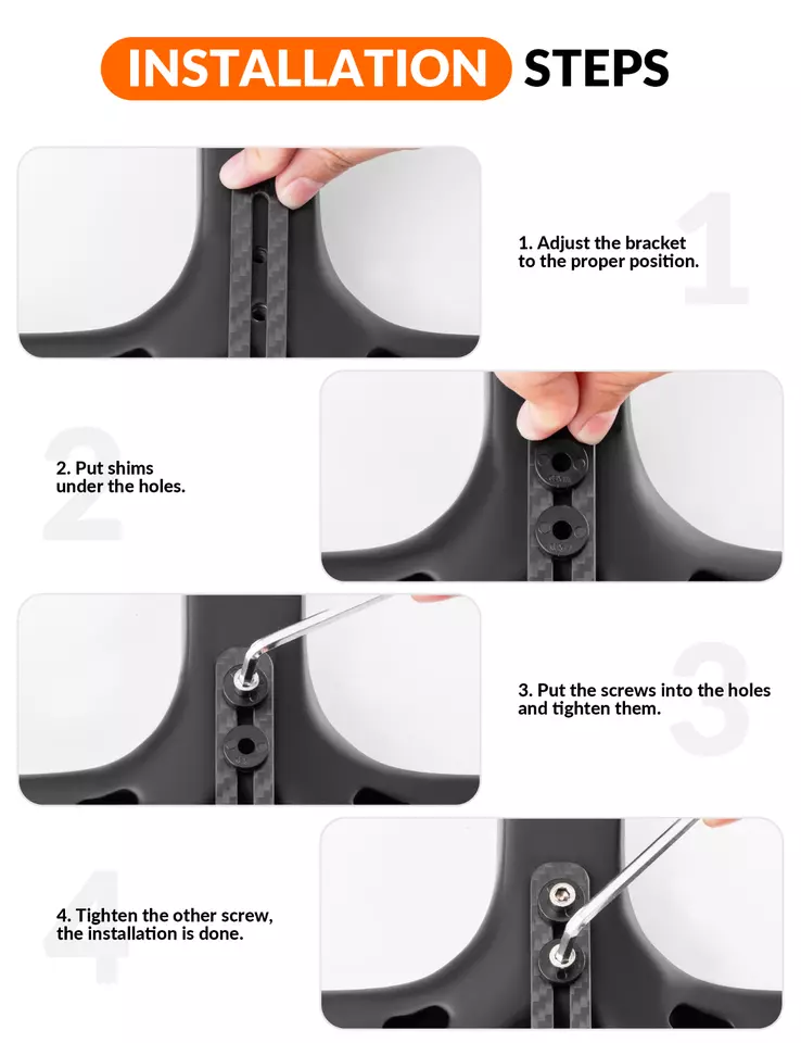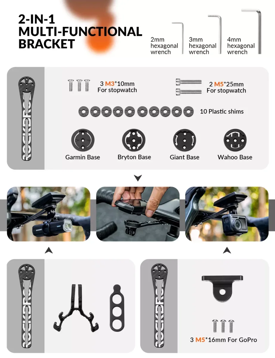 - Support Uniform Computer Le jeu de supports comprend des accessoires complets : 1. 4 plaques de base standard pour les ordinateurs Garmin, Bryton, Wahoo et Giant sont disponibles, et vous pouvez les changer avec un tournevis hexagonal de 2 mm. 2. La caméra d’action sportive peut être fixée à l’aide de l’adaptateur Gopro. 3. Vous pouvez également utiliser l’adaptateur pour éclairage de vélo pour fixer différents éclairages de vélo.