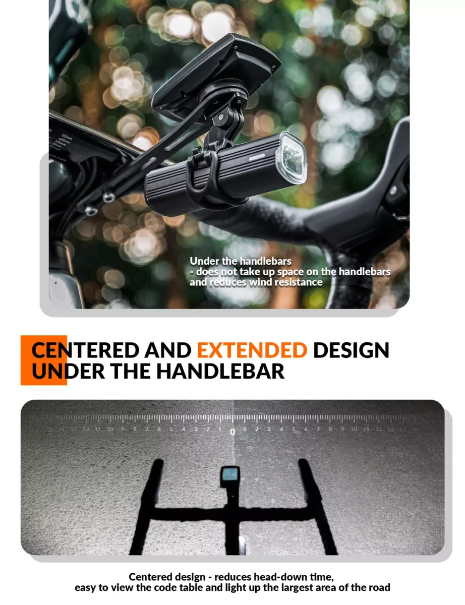 - Extension centrale Le système de montage étendu permet de positionner l’ordinateur de vélo au milieu du guidon du vélo. Pour les cyclistes qui ont souvent besoin de regarder des données informatiques pendant l’entraînement, cela peut réduire considérablement le temps passé à regarder vers le bas. Cette conception facilite l’opération. Dans le même temps, vous pouvez également installer les feux de vélo au centre pour créer une zone d’éclairage symétrique et rendre le paysage de rue plus facile à voir.