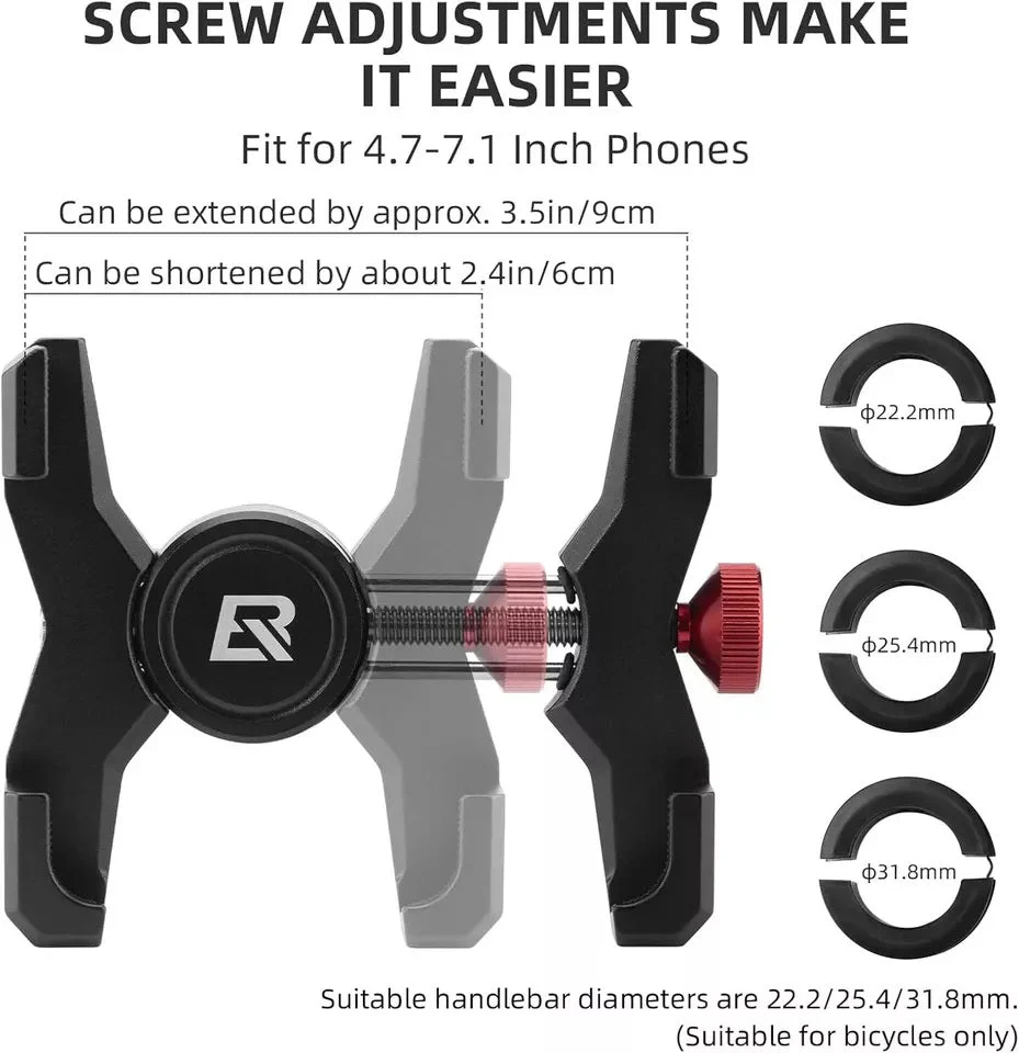 Patins antidérapants : Ce support de téléphone pour vélo est équipé de patins antidérapants aux quatre coins pour éviter les rayures sur votre téléphone. Il a été développé exclusivement pour les vélos et n’est pas compatible avec d’autres types de véhicules. Les diamètres de guidon appropriés sont 22,2/25,4/31,8 mm.