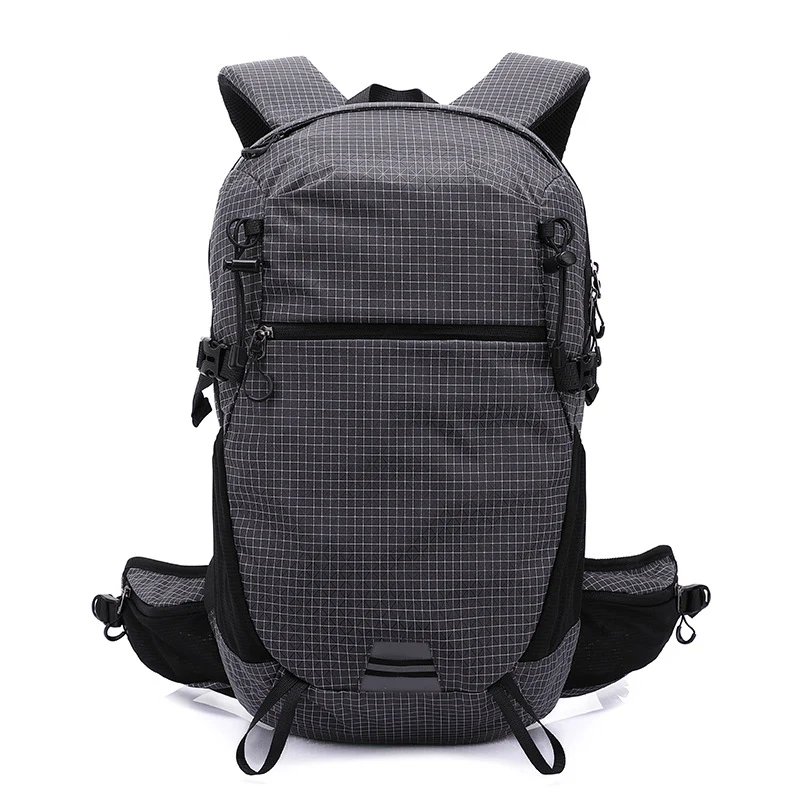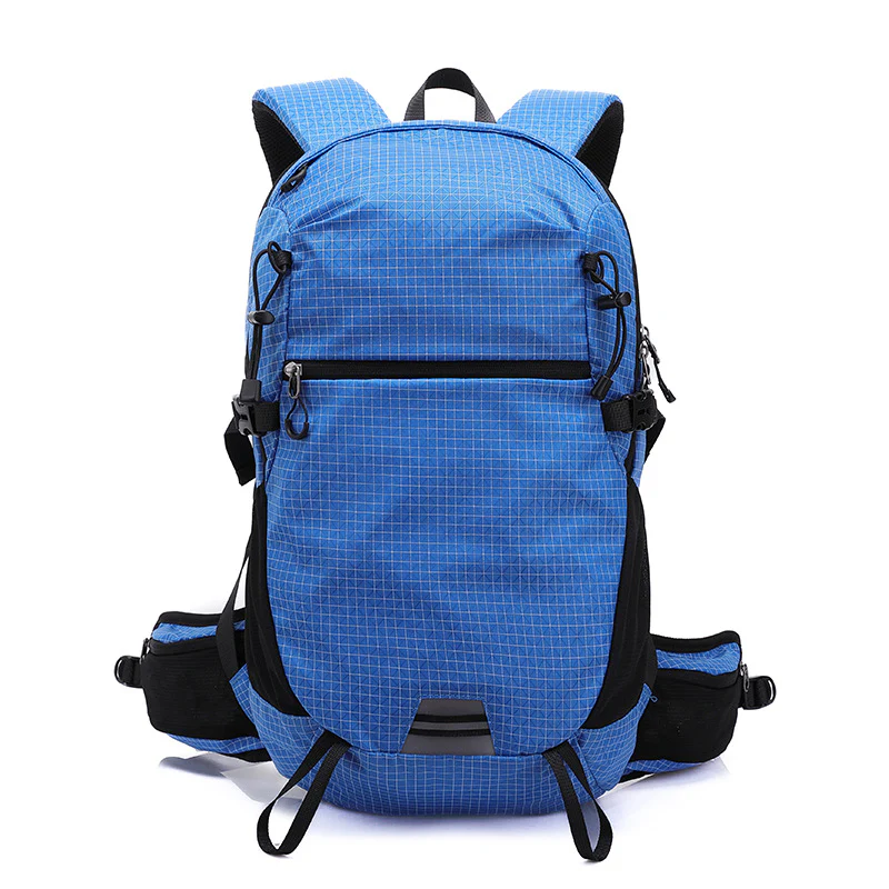 Corps en nylon/polyester ripstop léger avec revêtement hydrophobe. Dos ergonomique rembourré avec canaux d’aération et bretelles en maille respirante. Ceinture ventrale (avec poche téléphone) et sangle sternale réglables pour stabiliser la charge. Poids ≈ 800 g.