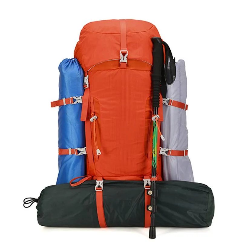- Compression et fixation : sangles latérales hautes/basses, attaches frontales, sangles basses pour tapis ou duvet.