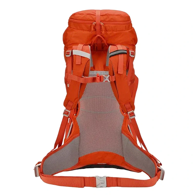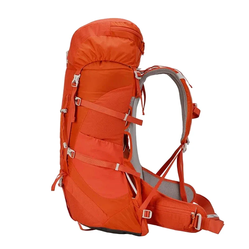Tissu principal en nylon Oxford déperlant et résistant à la déchirure, doublure polyester. Dos aéré avec canal de ventilation et armature interne souple pour maintenir la charge près du centre de gravité. Bretelles ergonomiques, ceinture ventrale rembourrée, sangle de poitrine réglable.