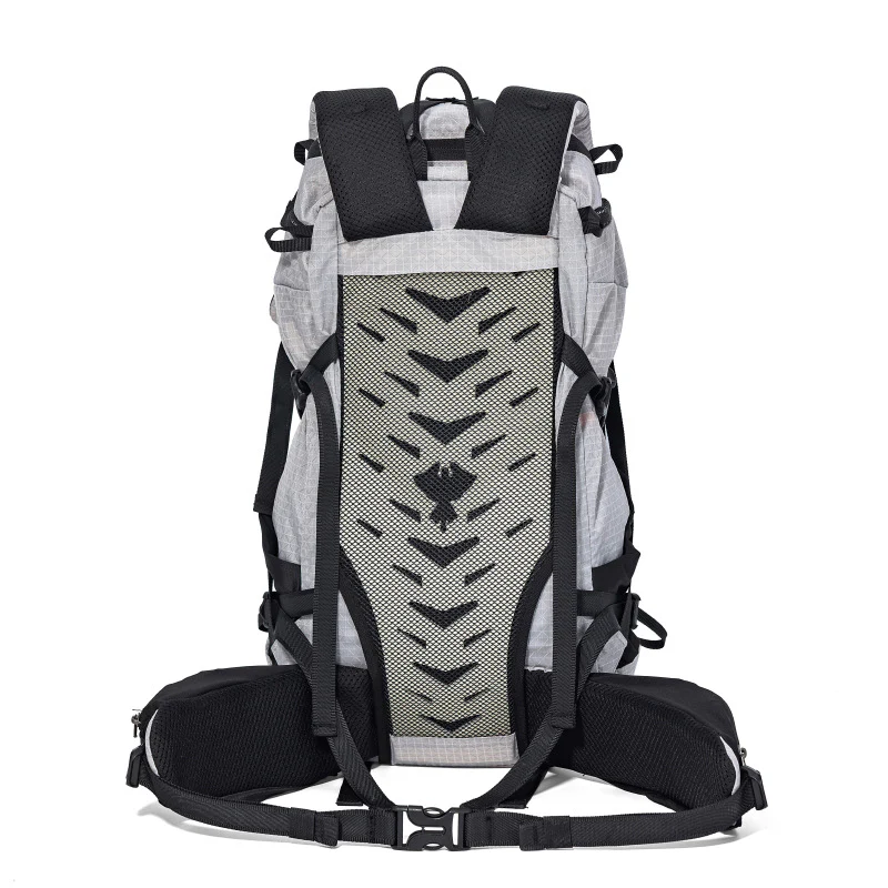 Le corps du sac est en nylon ripstop densité intermédiaire, avec traitement déperlant et doublure en fibre de polyester pour protéger le contenu de l’humidité légère. Le panneau dorsal et les bretelles utilisent une mousse perforée recouverte de maille respirante, formant des coussins d’air qui limitent la transpiration et évitent les points de pression sur les longues journées de marche.