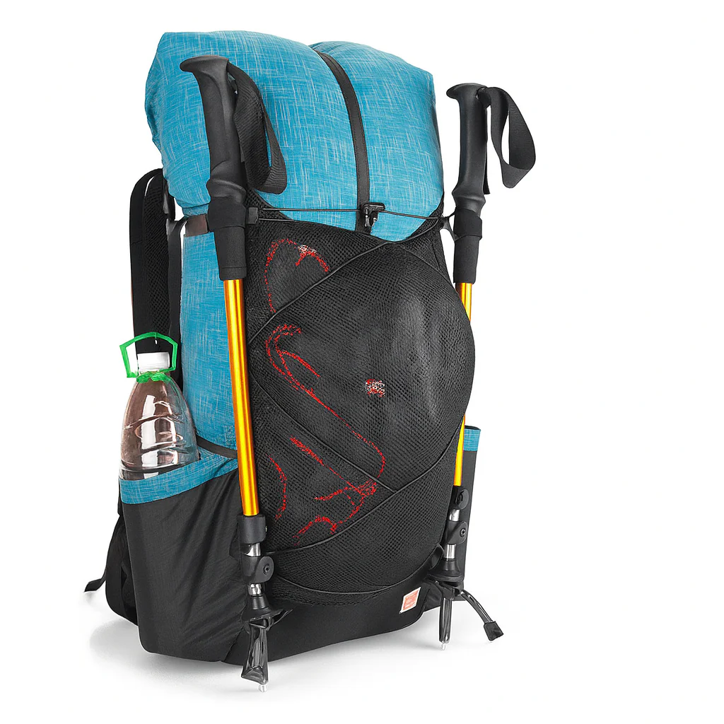 Corps en nylon 210D enduit PU, déperlant et résistant. Accastillage fiable avec fermetures YKK et boucles Duraflex visibles sur les photos. Portage sans armature : un matelas mousse (non inclus) se glisse dans la poche dorsale pour servir de cadre et améliorer la ventilation. Bretelles épaisses, sangle pectorale réglable, ceinture ventrale avec poches zippées. Grande poche frontale extensible et poches latérales inclinées en mesh pour gourdes. Cordage élastique frontal et multiples points d’accroche pour veste, tapis ou bâtons.