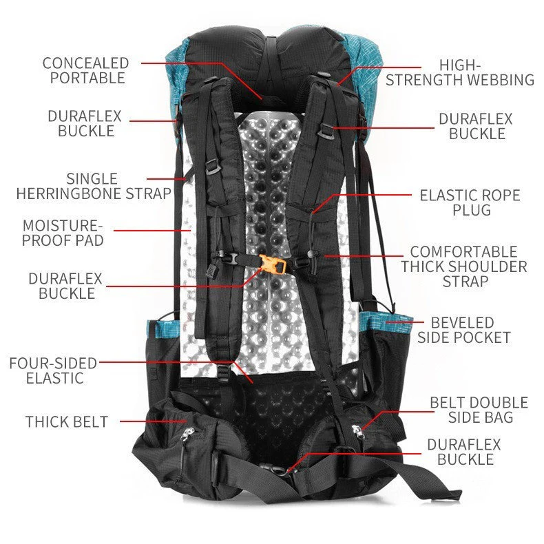 - Architecture ultralight sans armature : logement dorsal pour matelas mousse, portage efficace avec charge recommandée 8–12 kg (max. 15 kg).
