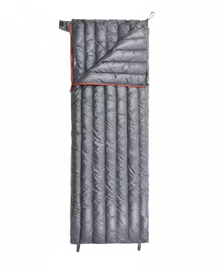 L’enveloppe 400T 20D nylon ripstop reçoit un traitement déperlant pour résister aux éclaboussures. La doublure 400T 20D est respirante pour limiter l’humidité interne. Le garnissage en duvet d’oie 90 % offre un excellent rapport chaleur/poids et une compression efficace.