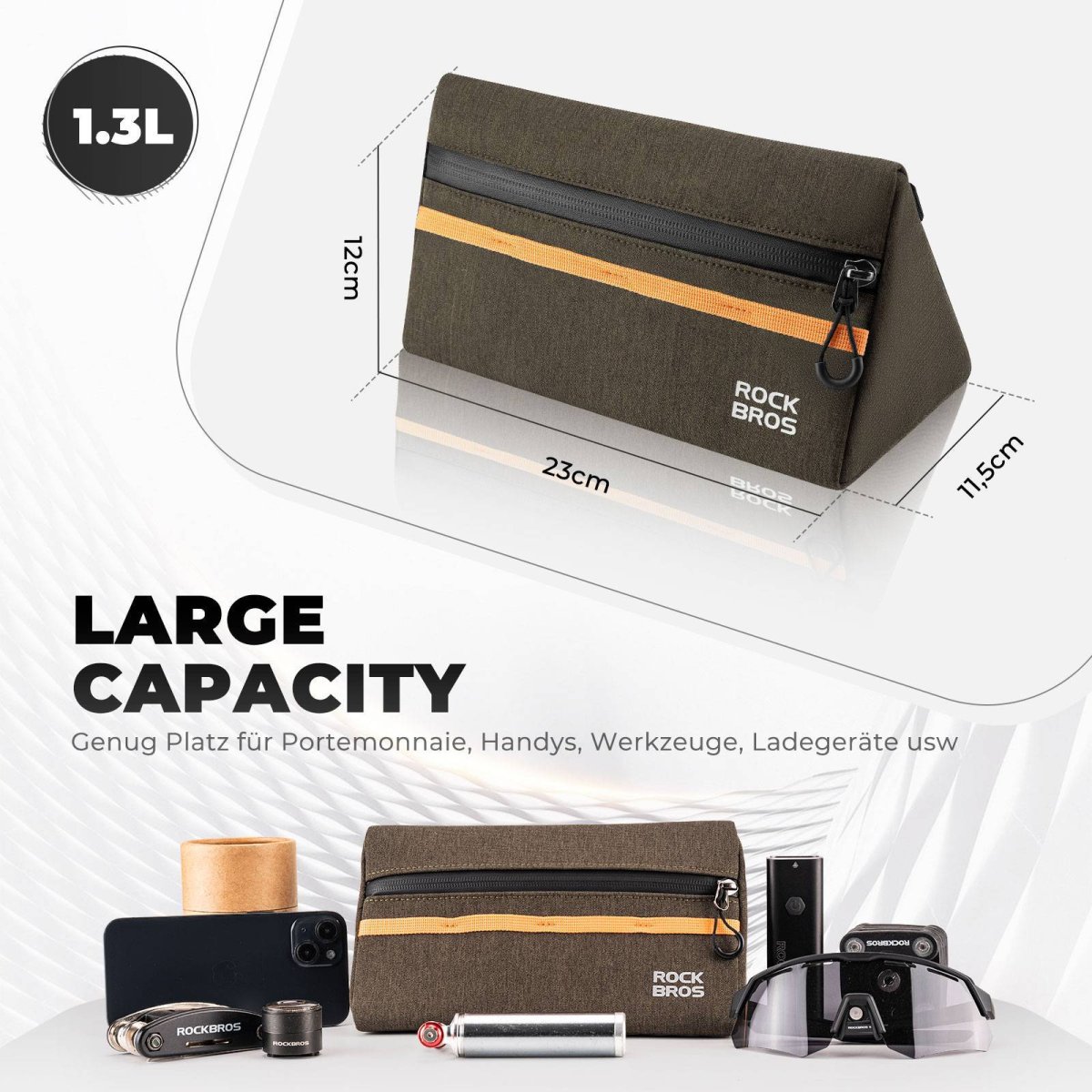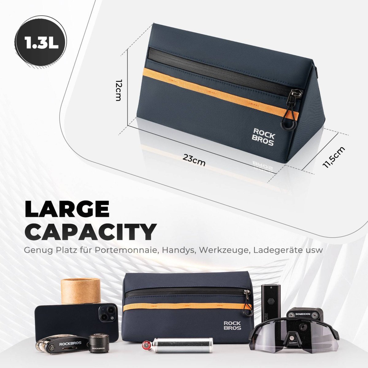 Dimensions approximatives : 23 cm x 12 cm x 11,5 cm, capacité de 1,3 L. Cette sacoche de guidon permet de ranger facilement des objets tels que téléphone portable, batterie externe, outils, portefeuille, barres énergétiques, etc. Elle répond à tous vos besoins quotidiens.