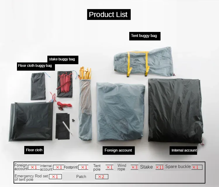 - Couleurs : gris-blanc 210T, kaki 210T, orange vif 210T (toutes livrées avec tapis de sol d’origine).
