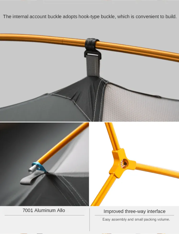 Le double-toit en polyester 210T enduction PU protège durablement des averses, tandis que la chambre en tissu 20D et mesh équilibre isolation et ventilation. Le sol renforcé affiche une colonne d’eau > 3000 mm pour bloquer les remontées d’humidité. Arceaux en alliage d’aluminium 7001 : rigidité élevée, poids contenu et montage intuitif par clips.