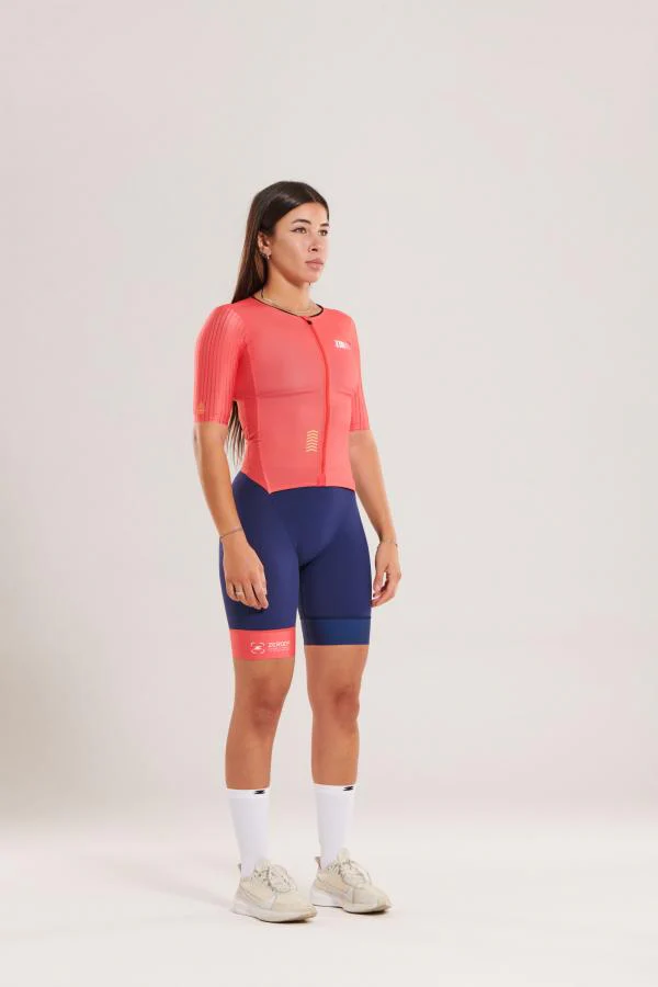 Elle présente un buste au design de type gilet avec un zip frontal intégral qui en facilite l’enfilage et le désenfilage. Le haut de la tenue permet ainsi de l’ouvrir comme une veste et sa bande grip en bas du buste assure un excellent maintien pendant l’effort. Elle a été élaborée pour améliorer notablement l’aérodynamisme et ainsi diminuer l’effet de traînée lors de la course. Elle intègre des manches classiques à la technologie AeroFlux avec découpe laser qui s’arrêtent en bas du biceps et recouvrent entièrement celui-ci pour un maintien idéal grâce à la bande intérieure en silicone. Par rapport à une peau nue, l’ajout de ces manches permet un gain aérodynamique, notamment en position de contre la montre sur la partie vélo.