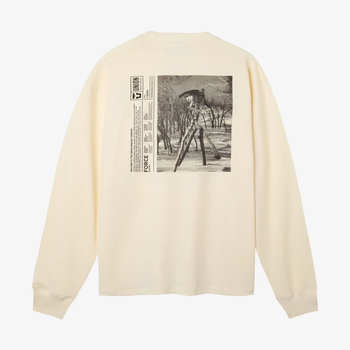 Un omaggio alle origini. La maglia Union Throwback a maniche lunghe mostra la nostra prima pubblicità con Travis Parker. Stampata su cotone di peso medio, unisce stile e storia per chi conosce le radici dello snowboard.