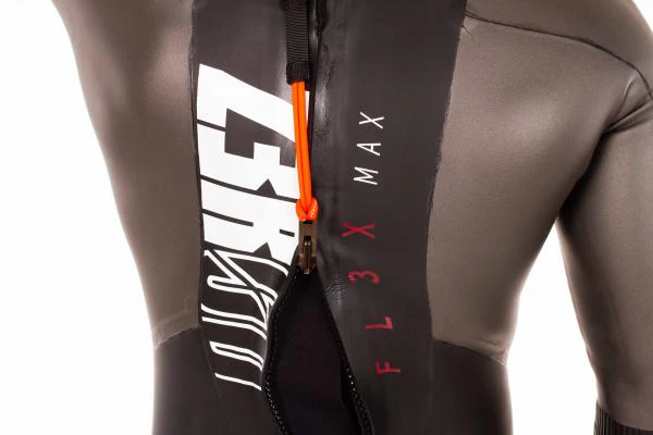 Elle présente une fermeture éclair inversée dans le dos qui se ferme de haut en bas, nécessitant une aide extérieure pour la fermer, mais permettant d’enlever la combinaison plus rapidement à la sortie de l’eau à T1.
